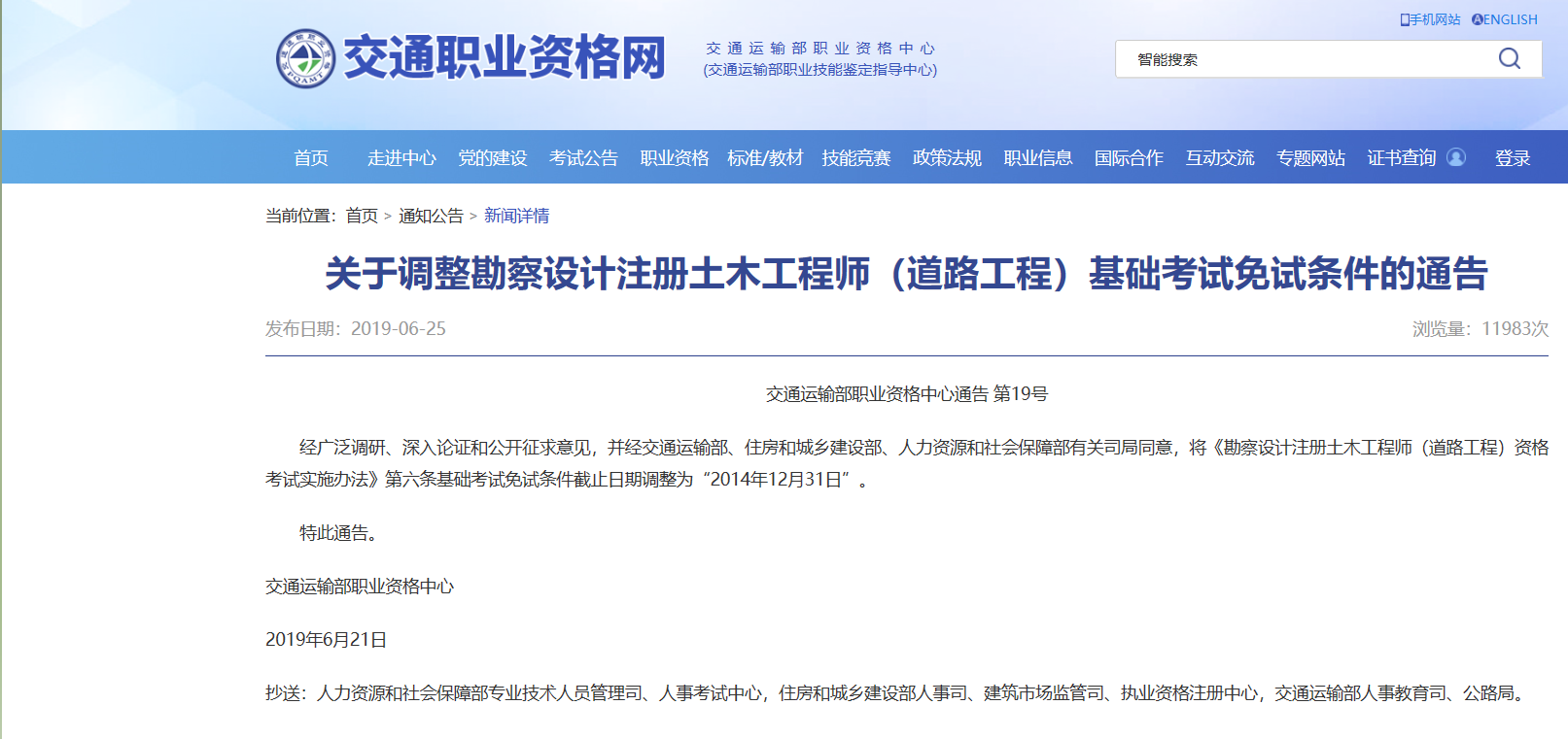 关于调整勘察设计注册土木工程师(道路工程)基础考试免试条件的通告