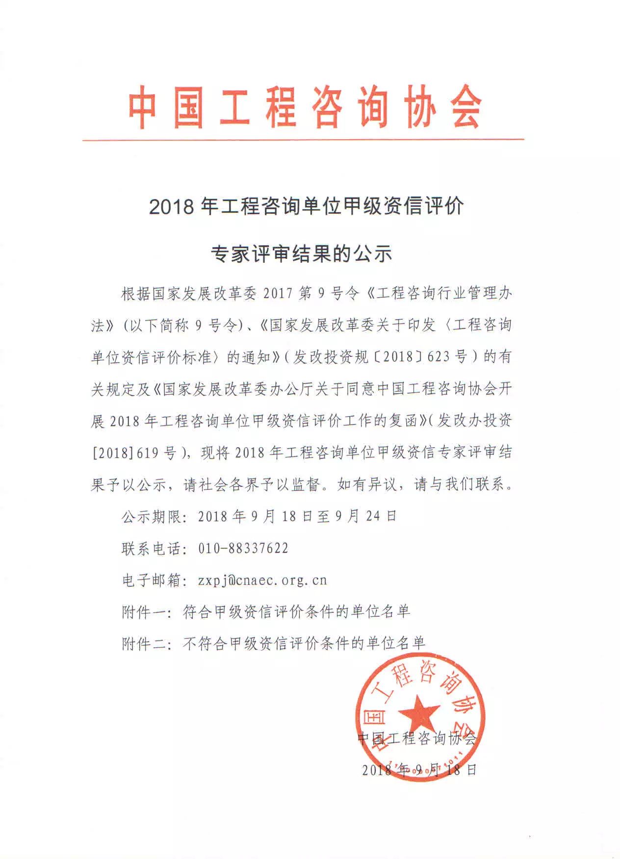 根据国家发展改革委2017第9号令《工程咨询行业管理办法》(以下简称9号令)、《国家发展改革委关于印发〈工程咨询单位资信评价标准〉的通知》(发改投资规〔2018〕623号)的有关规定及《国家发展改革委办公厅关于同意中国工程咨询协会开展2018年工程咨询单位甲级资信评价工作的复函》(发改办投资[2018]619号),现将2018年工程咨询单位甲级资信专家评审结果予以公示,请社会各界予以监督。
